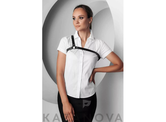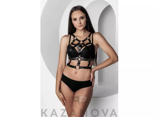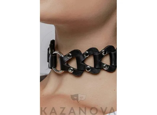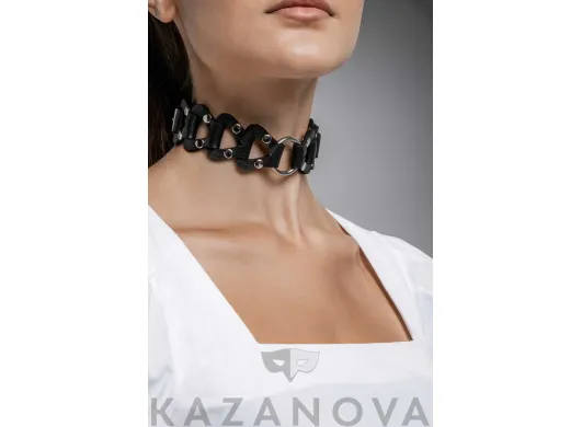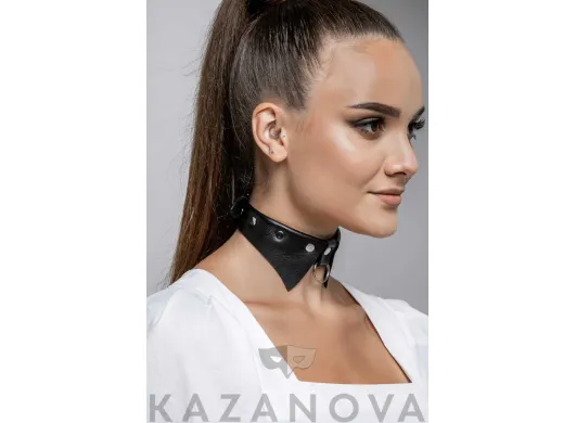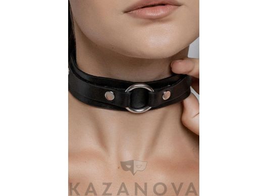 С кольцом и поводком . Сделан из натуральной кожи .