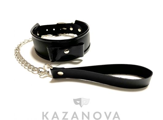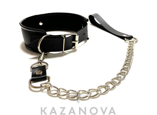 С кольцом и поводком . Сделан из натуральной кожи .