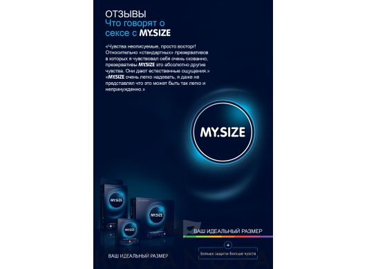 Немецкий бренд MY.SIZE любит точность и поэтому предлагает один раз измерить диаметр полового члена, соотнести с фирменным буклетом полученный результат и подобрать безупречно облегающие кондомы. В огромном каталоге презервативов по размерам ты обязательно найдешь те, что нужны именно тебе!