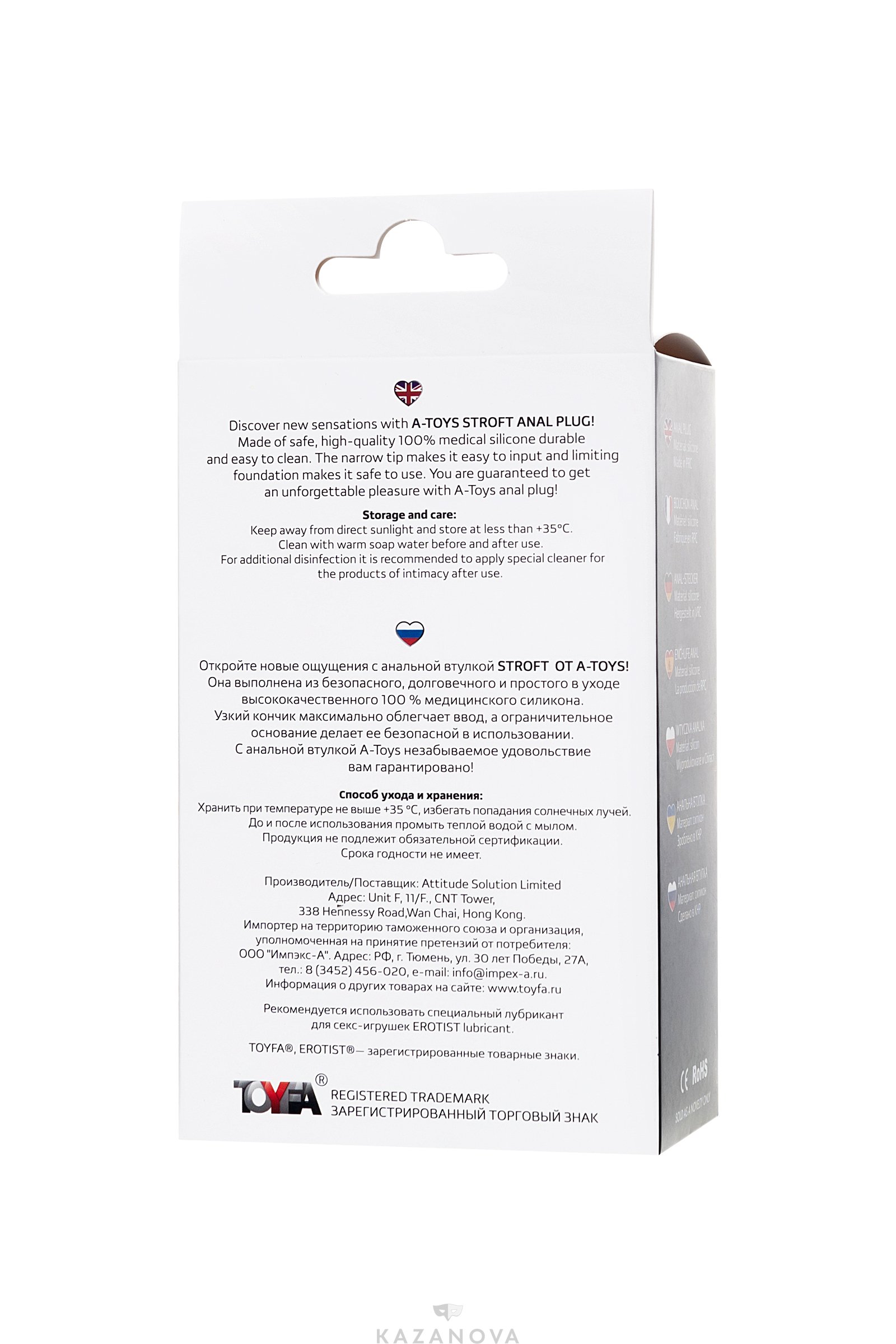 Откройте новые ощущения с анальной втулкой Stroft от A-Toys! Она выполнена из безопасного, долговечного и простого в уходе высококачественного 100 % медицинского силикона. Узкий кончик максимально облегчает ввод, а ограничительное основание делает ее безопасной в использовании. С анальной втулкой A-Toys незабываемое удовольствие вам гарантировано!