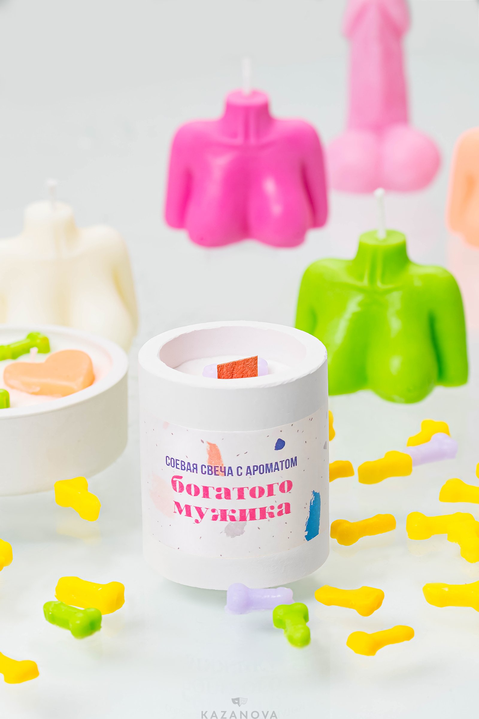 Свеча выполнена из качественного белого соевого воска, парафина и хлопкового фитиля. Интересные запахи интерьерной свечи украсят интерьер спальни, ванной, гостиной. А также разбавят обстановку взрослой тематической вечеринки или фотосессии.
