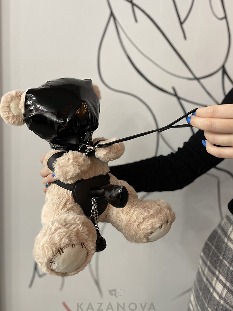 Плюшевый мишка в стиле BDSM с атрибутикой ручной работы российского бренда «Арсенал». На медведе маска с поводком и наручи.