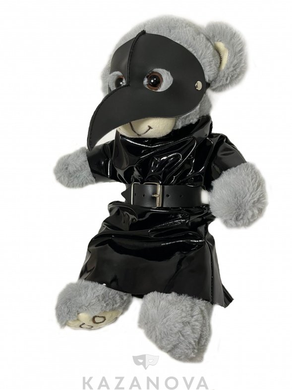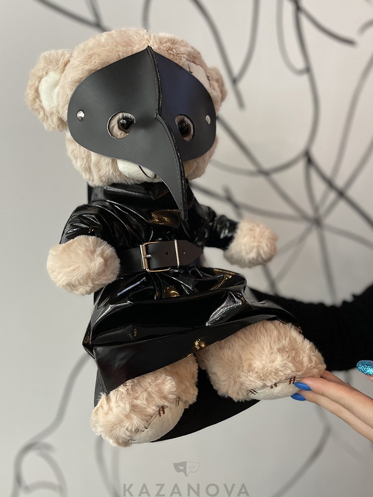 Плюшевый мишка в стиле BDSM с атрибутикой ручной работы российского бренда «Арсенал». На медведе плащ с поясом и маска чумного доктора.
