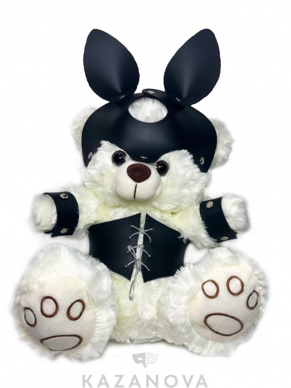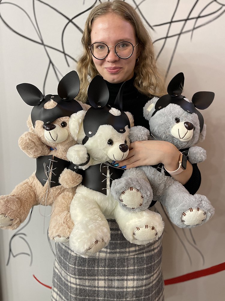 Плюшевый мишка в стиле BDSM с атрибутикой ручной работы российского бренда «Арсенал». На медведе маска, корсет со шнуровкой и наручи с цепочкой.