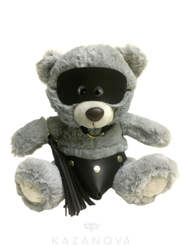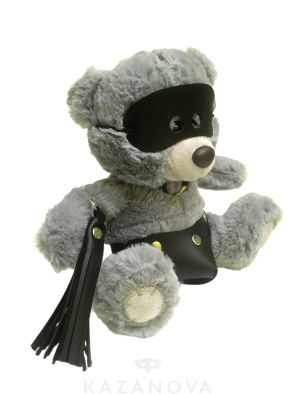 Плюшевый мишка в стиле BDSM с атрибутикой ручной работы российского бренда «Арсенал». На медведе маска, трусики из кожи и миниатюрный флогер.