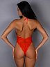 Боди красного цвета изготовлено из эластичной ткани с кружевной отделкой. Боди плотно облегает тело, выделяет грудь глубоким декольте и оставляет открытую спину. Зрительно удлиняет ноги за счет продуманного кроя нижней части.