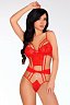Боди красно-бежевого цвета изготовлено из эластичной ткани с кружевной отделкой. Боди плотно облегает тело, выделяет грудь глубоким декольте и оставляет открытую спину. Зрительно удлиняет ноги за счет продуманного кроя нижней части.