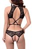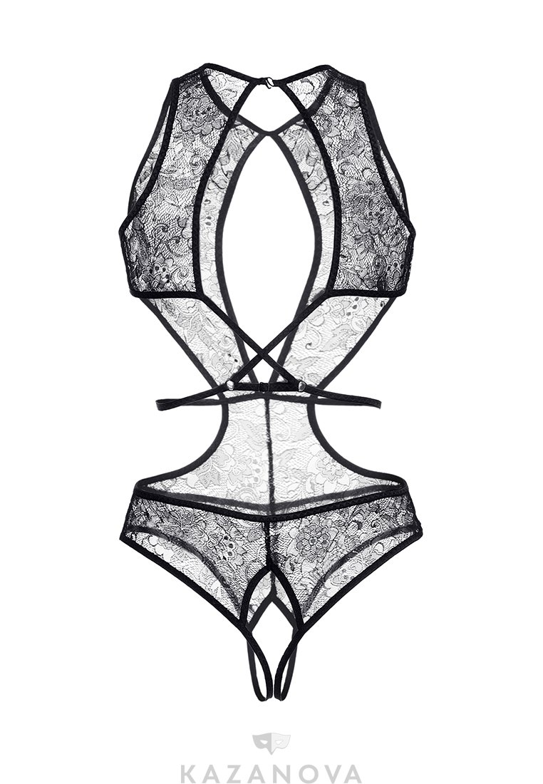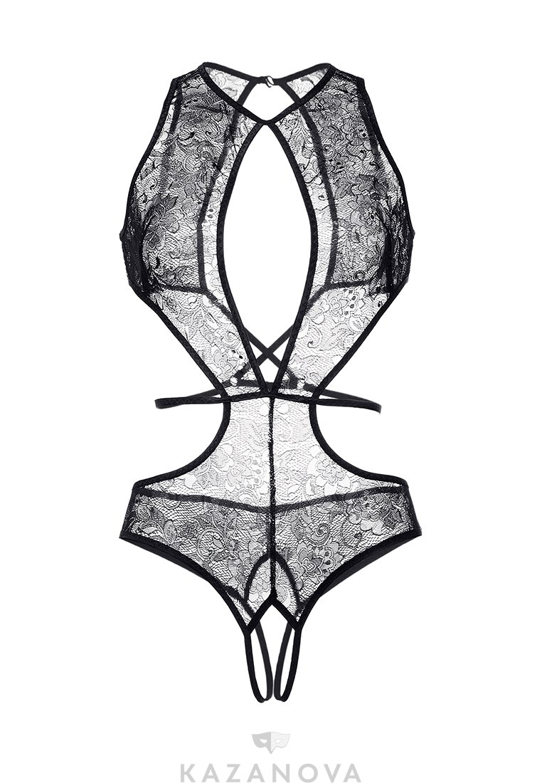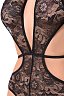 Эротическое боди Erolanta Lydia из плотного кружевного полотна, с фигурным декольте. Застежка на шее. Открытая спинка. Перекрещивающиеся бретели соединены с регулируемым поясом.