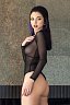 Деликатные вертикальные швы акцентируют внимание на плавных изгибах тела и обеспечивают идеальную посадку. Горизонтальный шов визуально подчеркивает грудь. Обтягивающие рукава добавляют грациозности силуэту. Застежка на шее, аккуратно приоткрытая спинка и эротический доступ — важные детали чувственного образа.