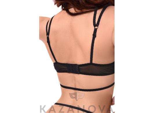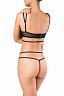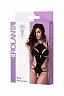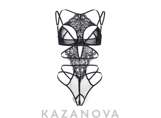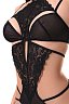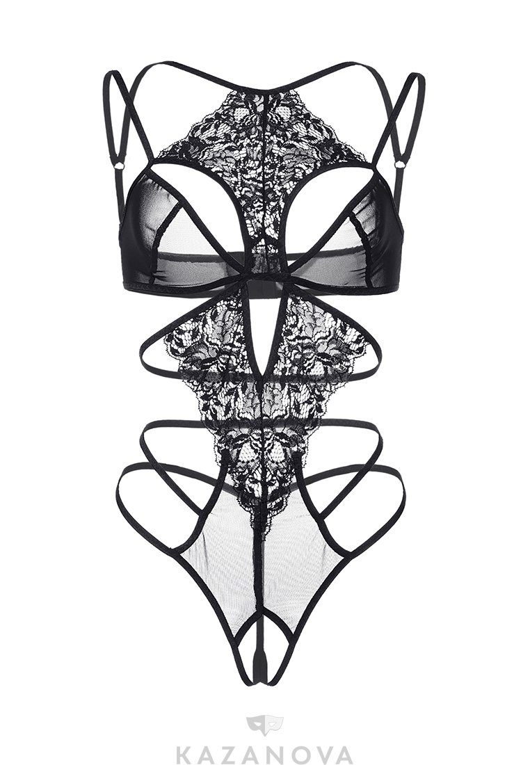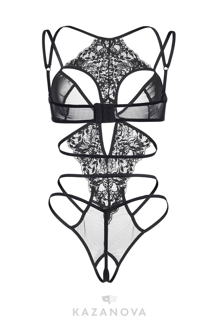 Боди черного цвета изготовлено из эластичной ткани с кружевной отделкой. Боди плотно облегает тело, выделяет грудь глубоким декольте и оставляет открытую спину. Боди оставляет доступ к интимным зонам.