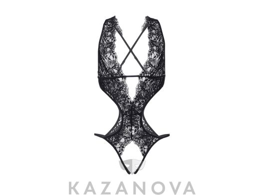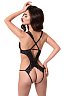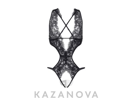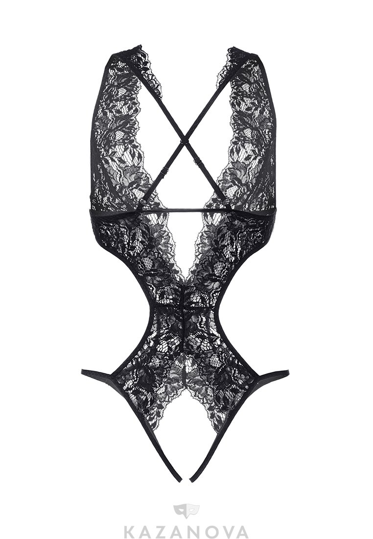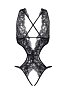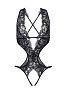Боди черного цвета изготовлено из эластичной ткани с кружевной отделкой. Боди плотно облегает тело, выделяет грудь глубоким декольте и оставляет открытую спину. Боди оставляет доступ к интимным зонам.