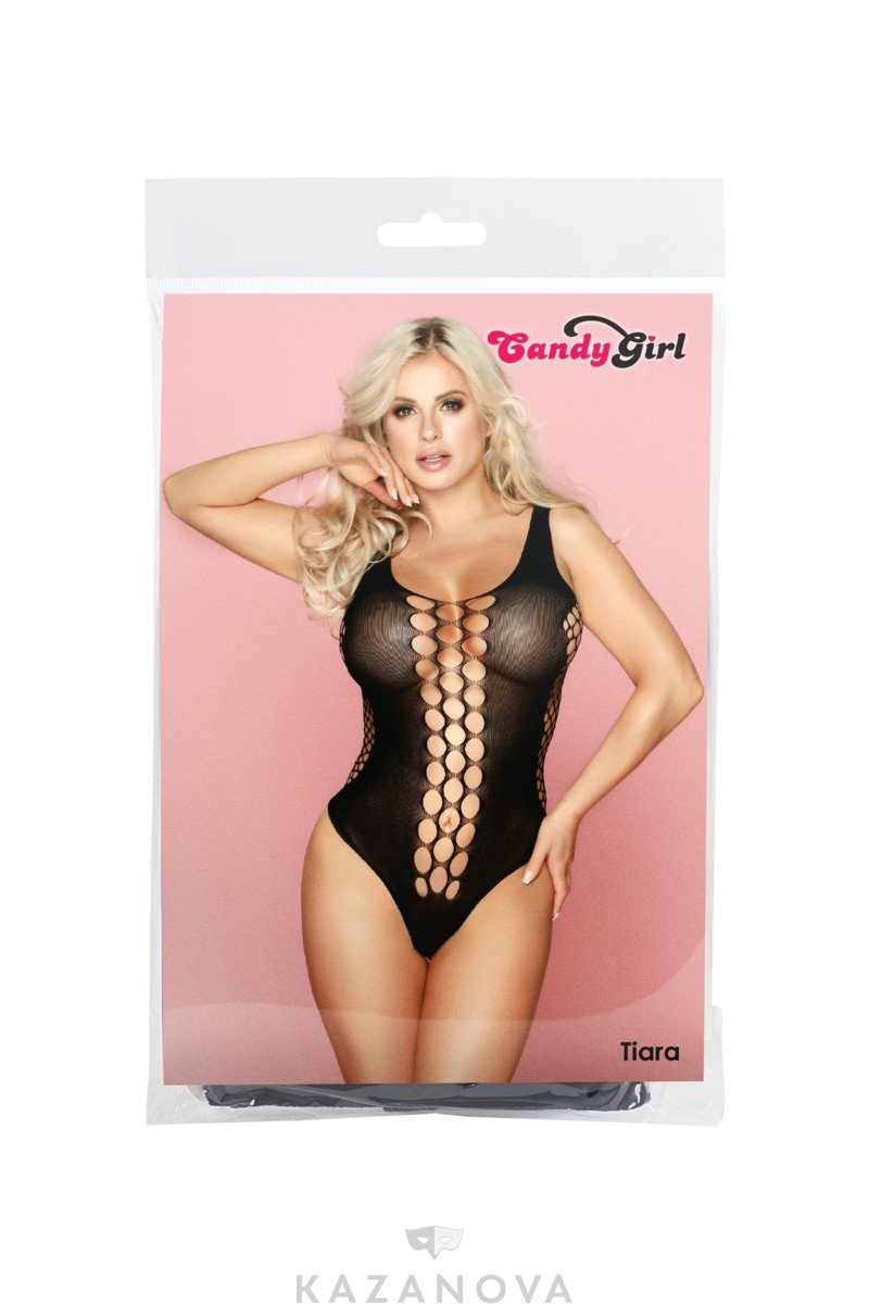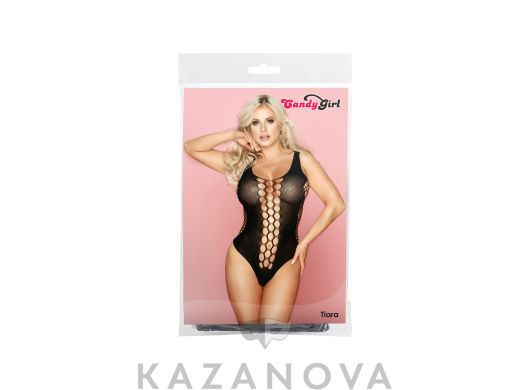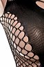 Черное боди сделано из эластичной ткани в крупную и мелкую сетку.