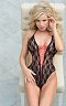 Черное боди из полупрозрачной ткани позволяет рассмотреть все, что скрыто. Боди плотно облегает тело, глубокое декольте и красная шнуровка привлекают внимание к груди. Боди оставляет открытой спину и отлично сочетается с чулками.