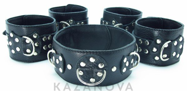 Бондажный комплект Арсенал из натуральной кожи черный (наручи, поножи, ошейник)