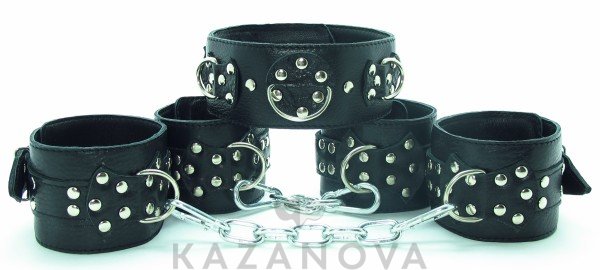 Наручи и поножи соединяются между собой и легко регулируются по размеру. В комплект входит ошейник. Наручники надежно фиксируются на запястьях, а поножи на щиколотках, их трудно снять без помощи партнера.