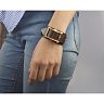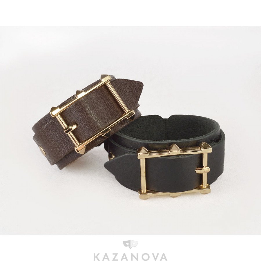 Браслет коричневый цвета сделан из мягкой натуральной кожи и декорирован полоской черной кожи и пряжкой из металла.