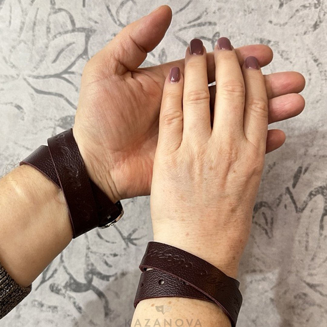 В комплект входят 2 браслета из мягкой натуральной кожи. На каждом браслете с помощью тиснения нанесена часть фразы: