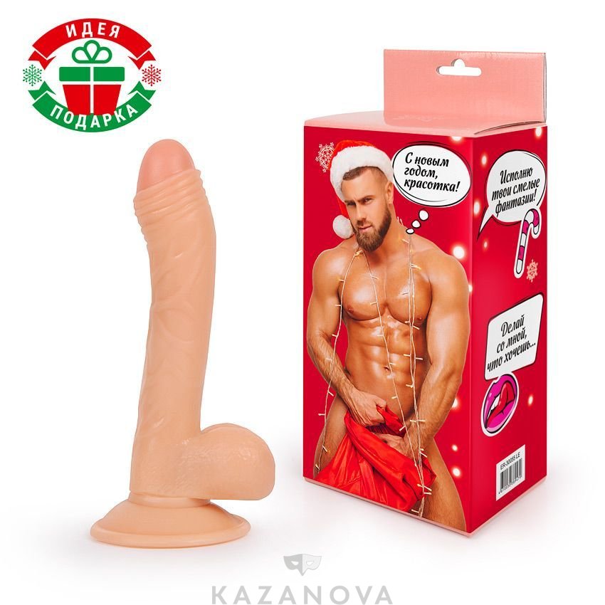 Секс-игрушка сделана из эластомера телесного цвета и упакован в праздничную коробку.