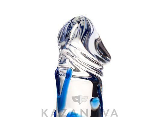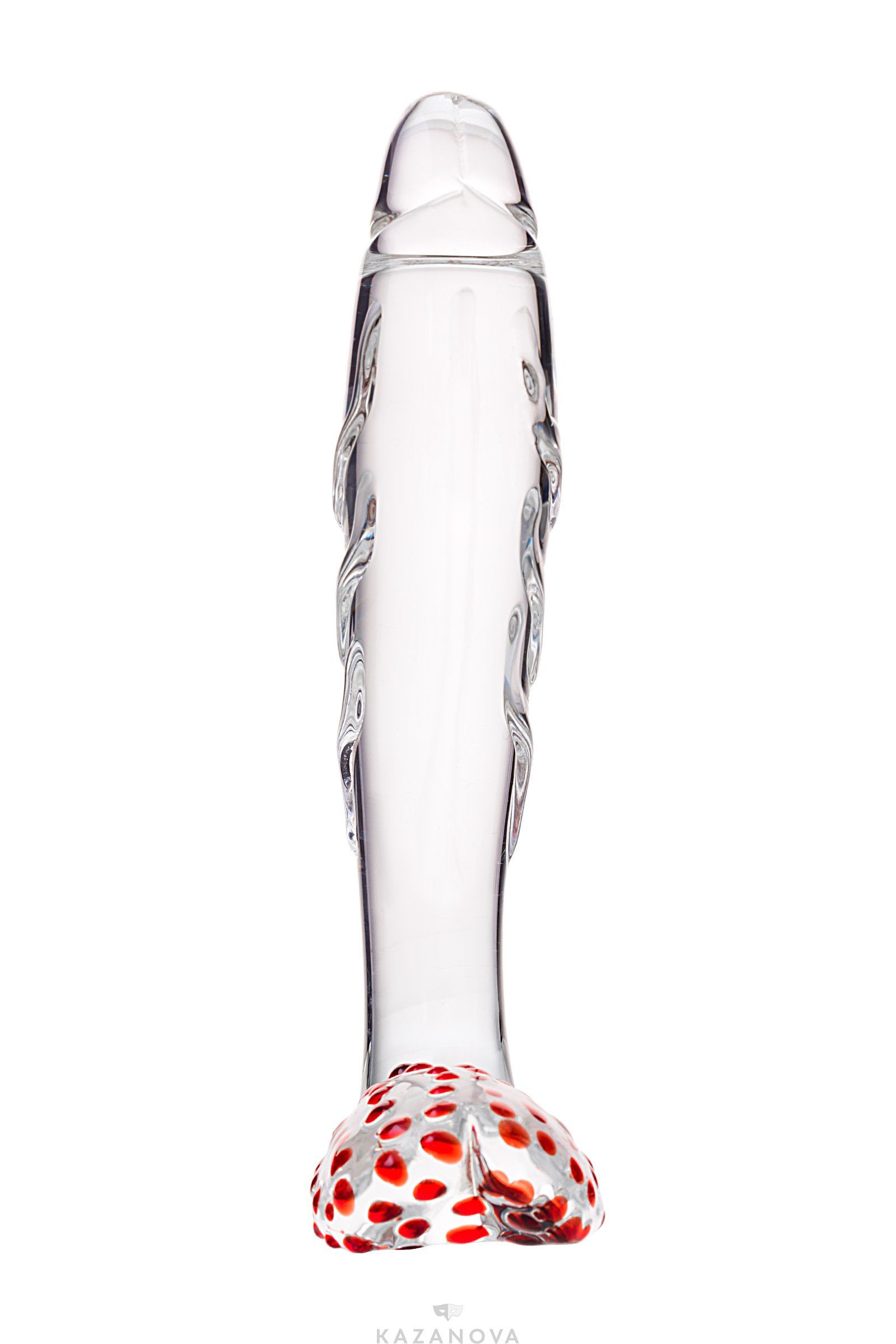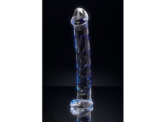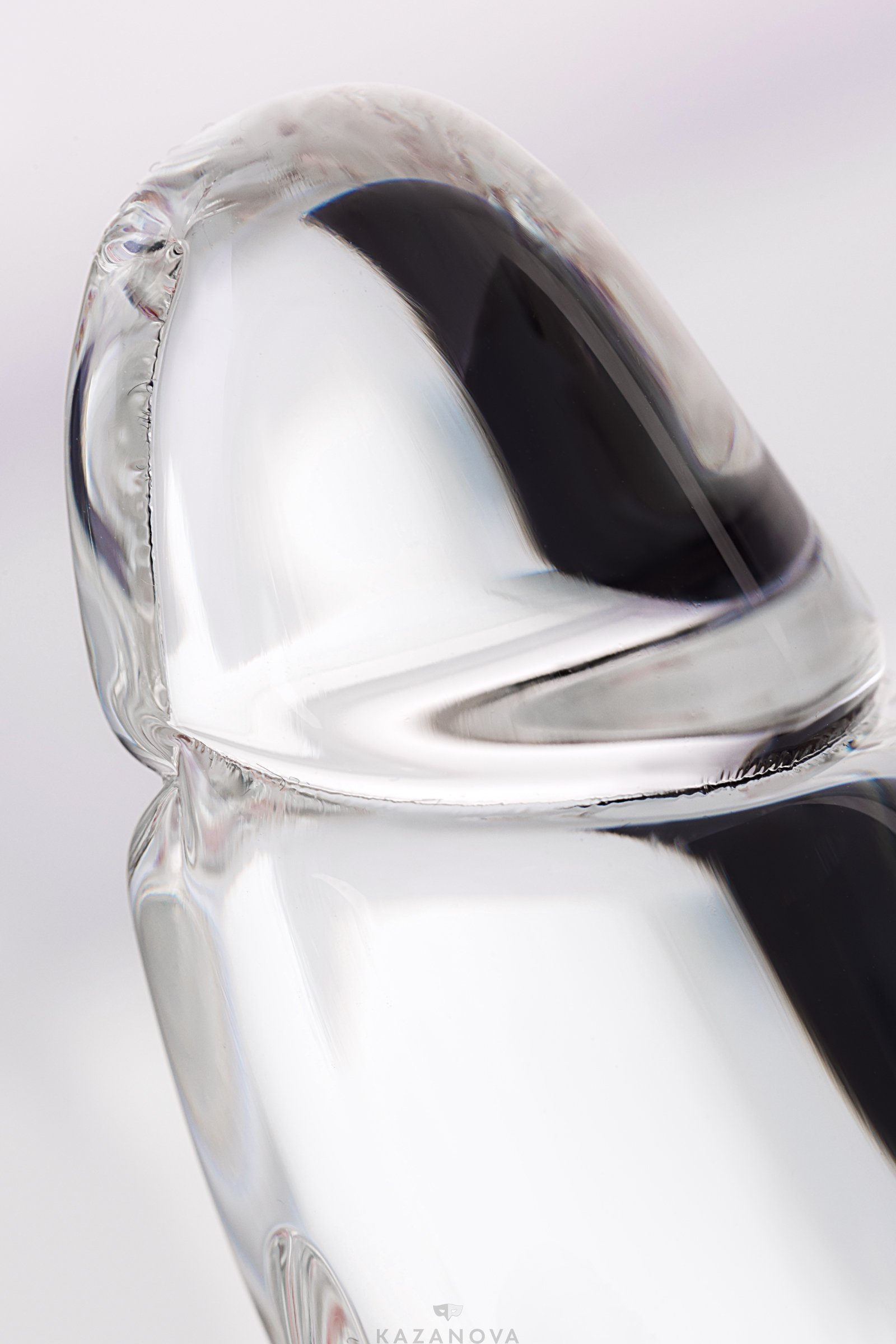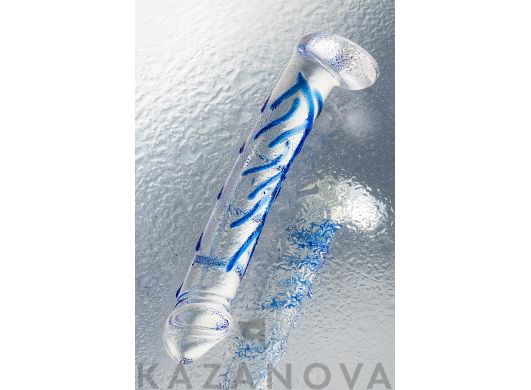 Двусторонний фаллоимитатор из стекла с выделенной головкой и венами с одной стороны и рельефными "шишечками" - с другой.