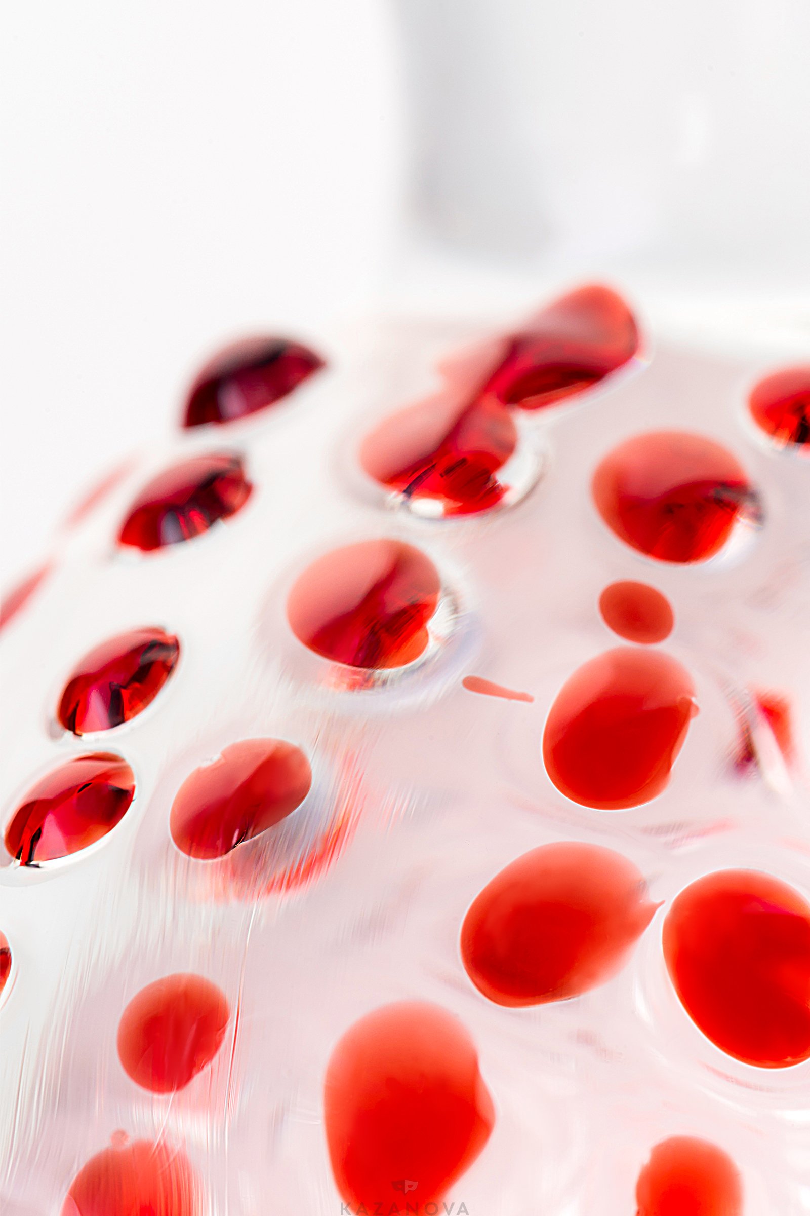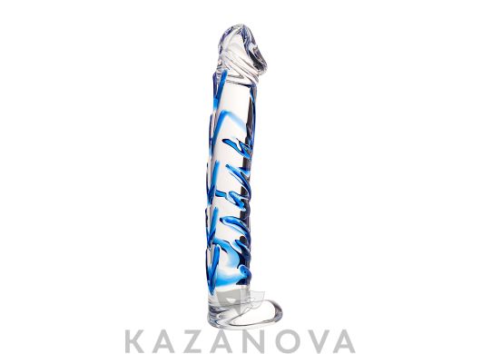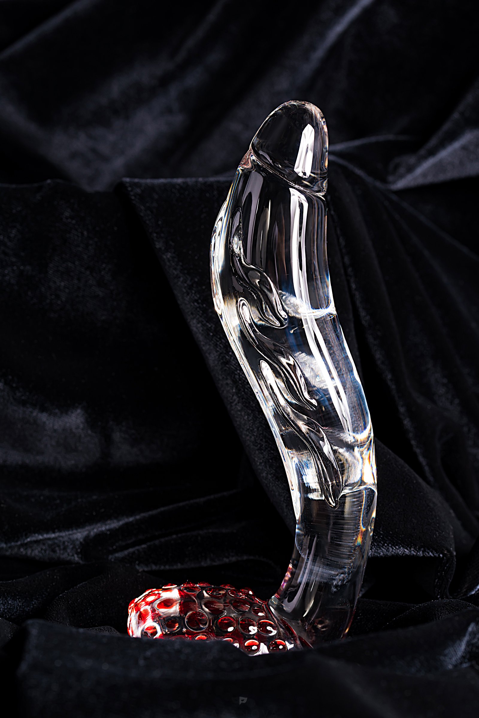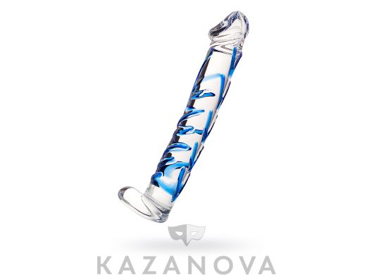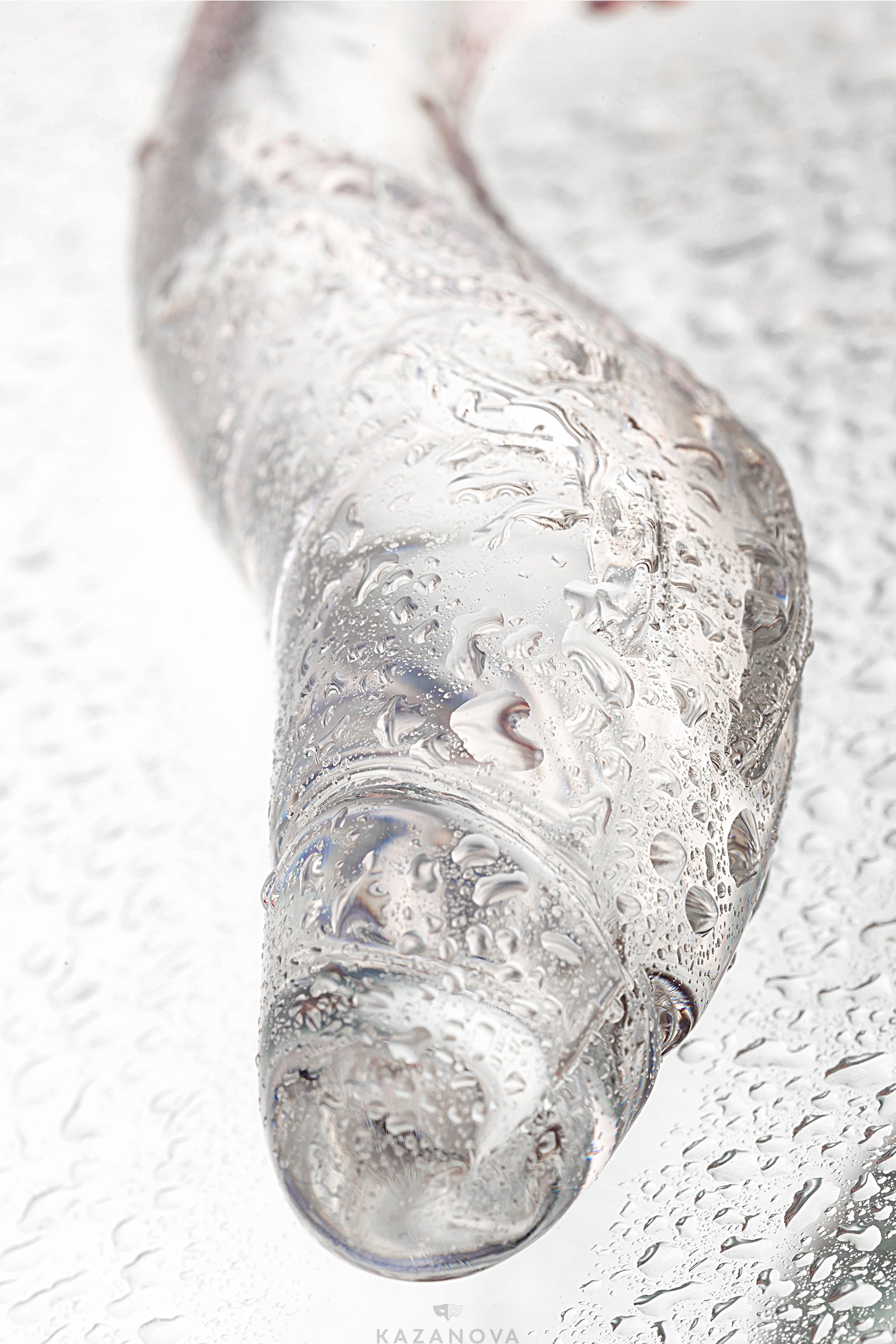 Двусторонний фаллоимитатор из стекла с выделенной головкой и венами с одной стороны и рельефными "шишечками" - с другой.