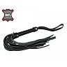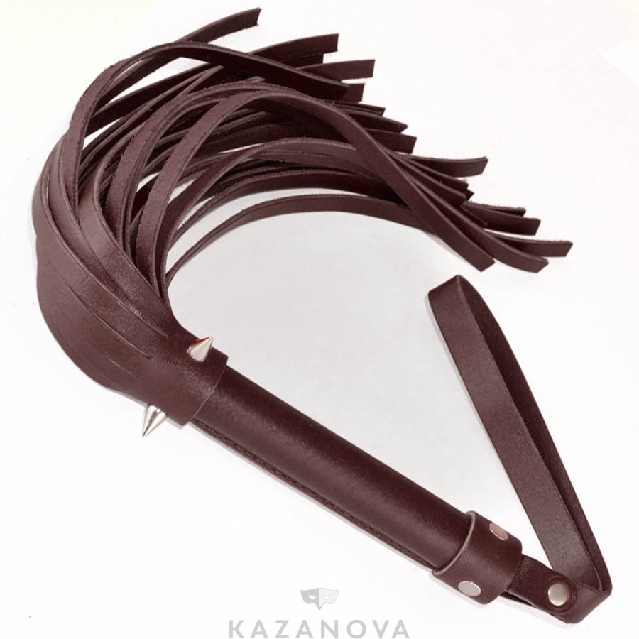 Флогер сделан из качественной и мягкой натуральной кожи черного цвета. Девайс имеет жесткую рукоять, гладкие концы и петлю. Ручка декорирована шипами из металла.