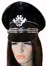 Фуражка с козырьком и кокардой сделана из ткани черного цвета.