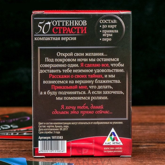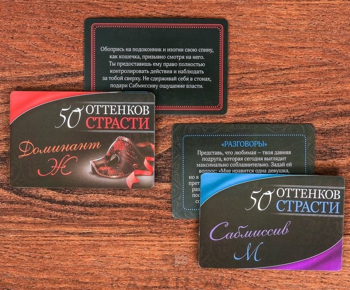 В наборе 50 карточек с разнообразными эротическими заданиями для двоих.