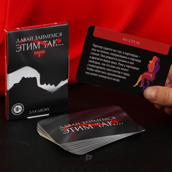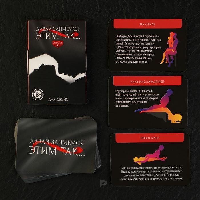 В коробке находятся 20 карточек с вариантами позиций. Тяни карточку, предлагай второй половинке сделать так и наслаждайся!