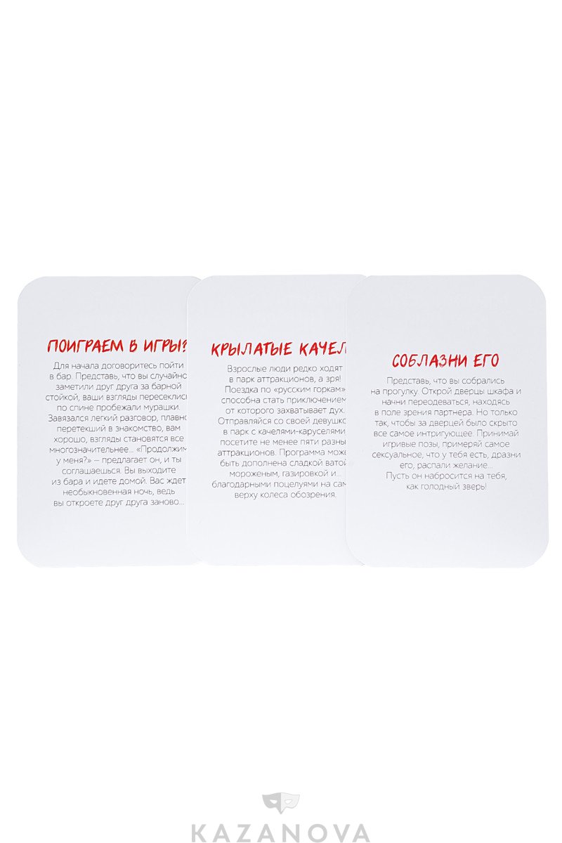 В наборе девять романтических сценариев «для его» действия, десять – «для нее», и семь горячих сценариев «для двоих», чтобы добавить перчинку в интимную жизнь. Достаточно выбрать любой и наслаждаться новыми эмоциями.