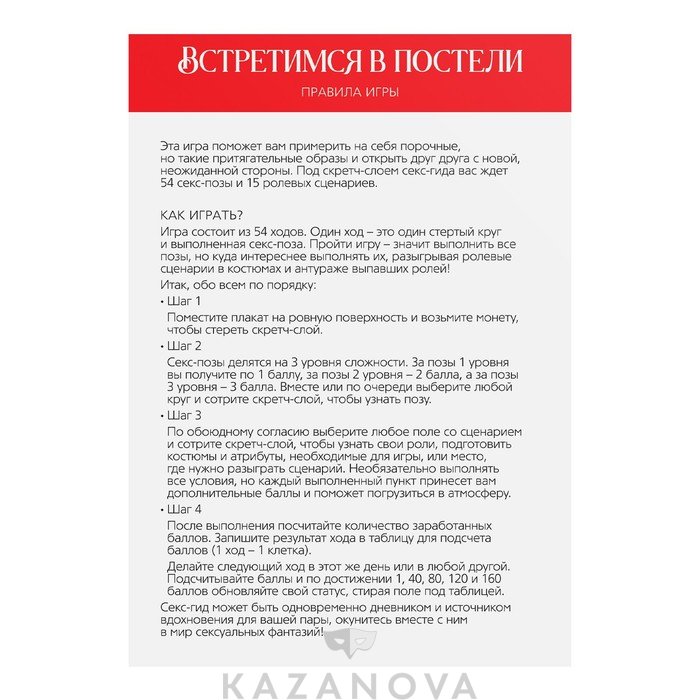 В интимной жизни не хватает разнообразия и новизны? Есть отличное решение, которое понравится тебе и партнеру – скретч-игра «Секс-гид. Встретимся в постели»!