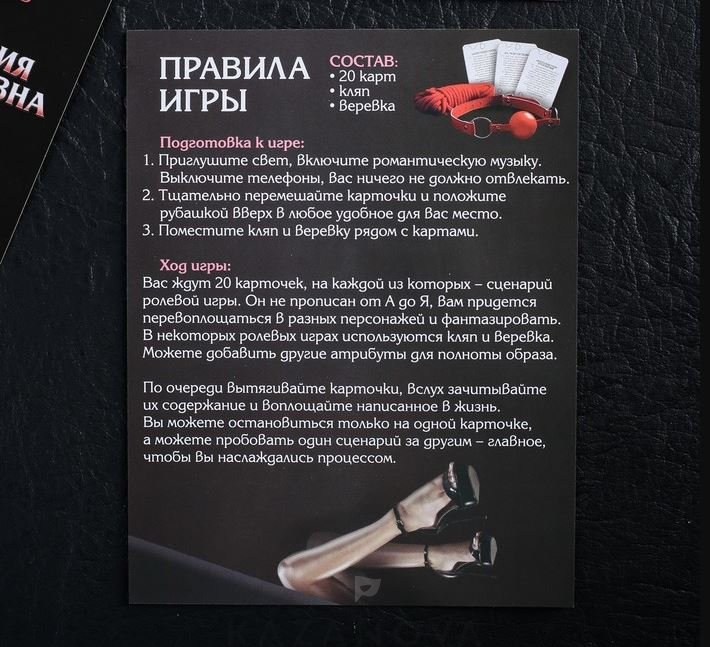 Состав: 20 карт, правила игры, кляп, верёвка.