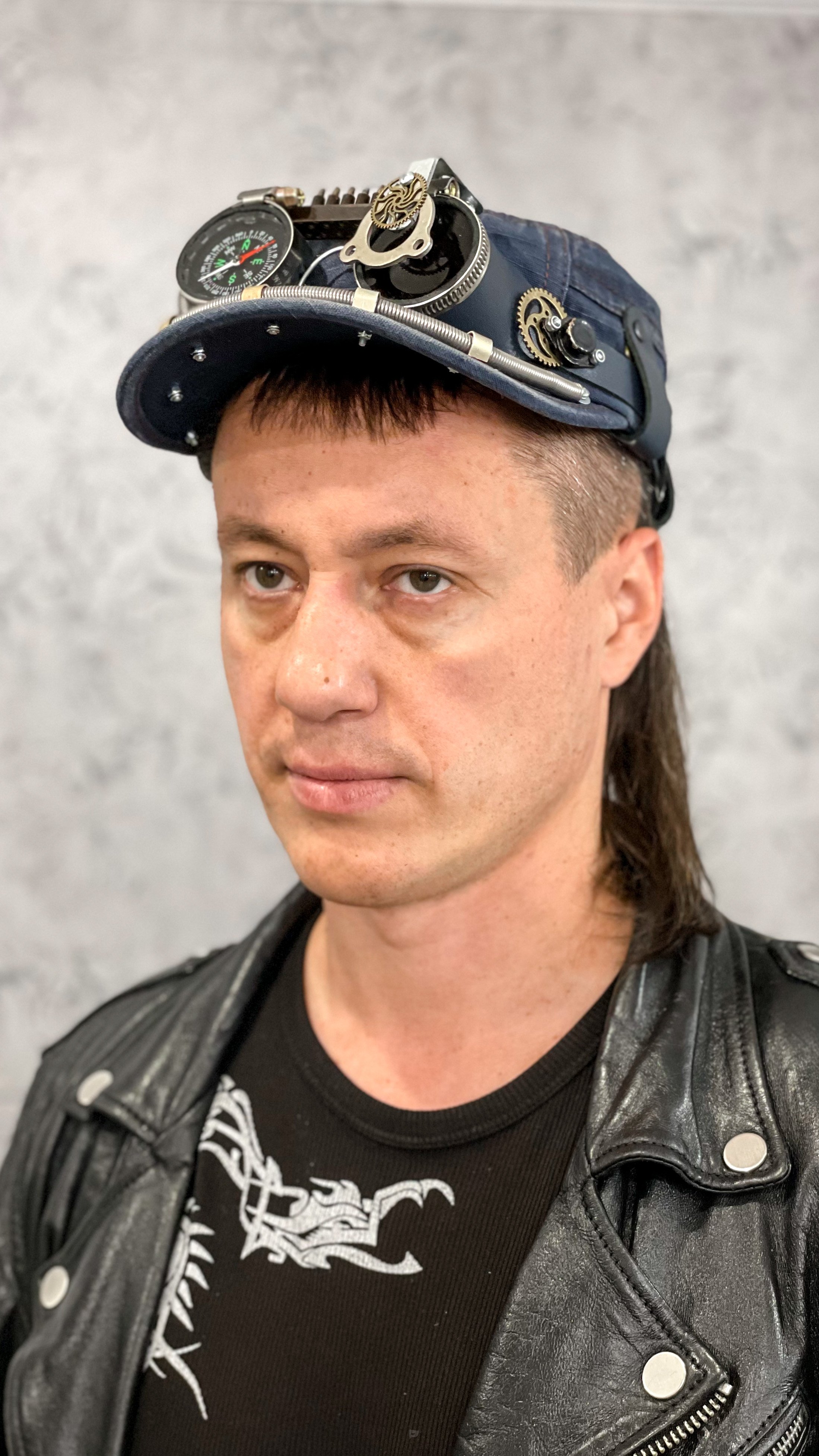 Кепка из кожи и металла идеально подойдет для фотосессий, косплея или ролевых сценариев.