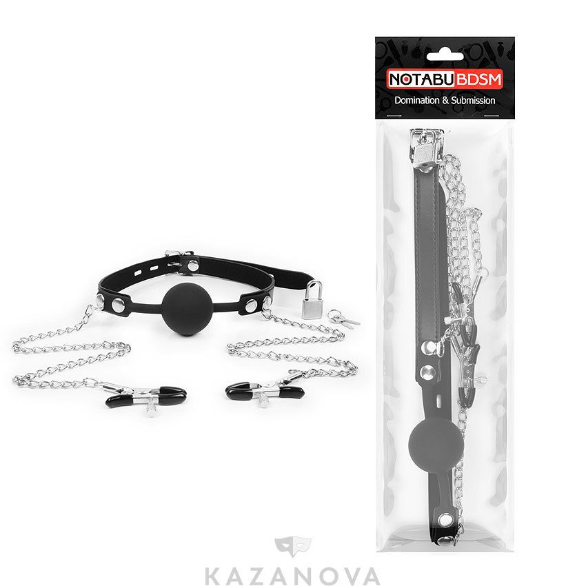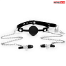 Кляп подстраивается под индивидуальные параметры. На ремешке кляпа фиксируются зажимы для сосков на тонких цепочках с силиконовыми накладками регулируемой силой давления.