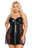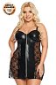 Черное платье с кружевной отделкой и виниловыми вставками изготовлено из полупрозрачной ткани. Платье привлекает внимание к зоне декольте