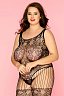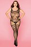 Комбинезон черного цвета изготовлен из эластичной ткани в крупную и мелкую сетку.