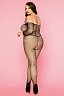 Комбинезон черного цвета изготовлен из эластичной ткани в крупную и мелкую сетку.