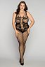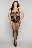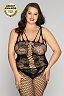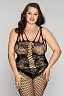 Комбинезон черного цвета изготовлен из эластичной ткани в крупную и мелкую сетку.