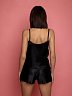 Черный комплект изготовлен из атласной ткани с мерцающим блеском и кружевной отделкой. Комплект состоит из топа на бретелях и шорт.