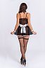 Короткое платье из кружевной ткани черного цвета с белой отделкой и выделенной зоной декольте привлекает внимание к роскошной груди и позволяет любоваться стройными бедрами и ножками. Миниатюрный фартук добавляет в образ желанной игривости.