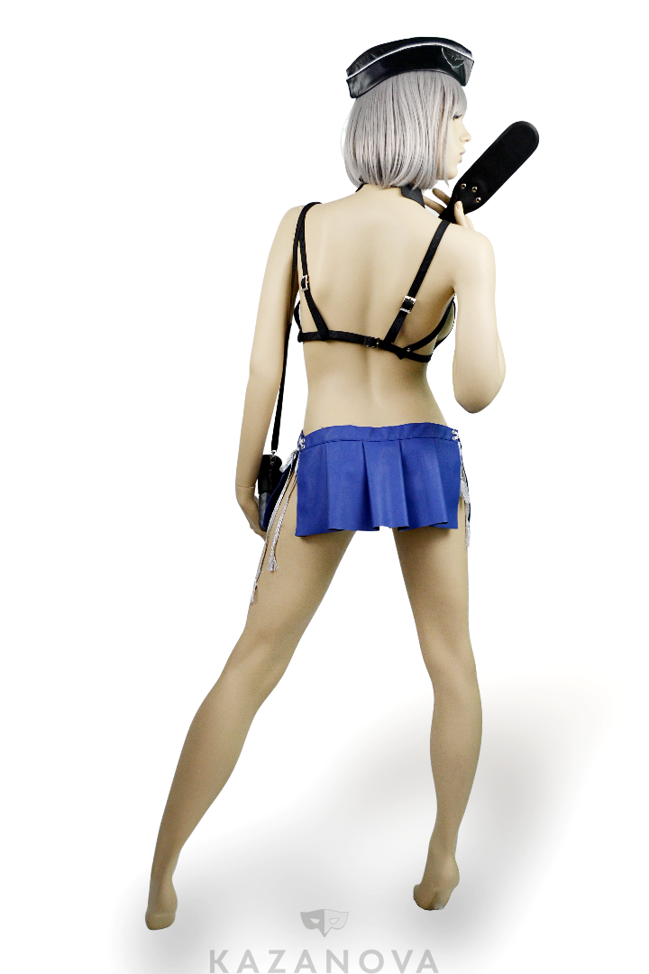 В комплект входят: топ, юбка, галстук, головной убор, спанк и два фаллоимитатора.