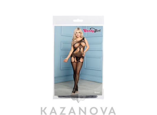 Комбинезон из мелкой и крупной сетки плотно облегает тело, подчеркивает грудь, тонкую талию и бедра, а также оставляет доступ к интимным зонам. Сетка имитирует топ и чулки с поясом и пажами.