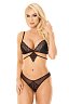 Восхитительные бюстгальтер и трусики выполнены из полупрозрачной сетки черного цвета с отделкой из кружева. Сексуальные вставки кружева на лифе красиво облегают грудь, мягкие чашечки на регулируемых бретелях поддерживают бюст. Изящное украшение со стразом под бюстом застегивается на спинке на крючок. Стринги из прозрачной сетки декорированы кружевной вставкой, спускающейся к промежности.