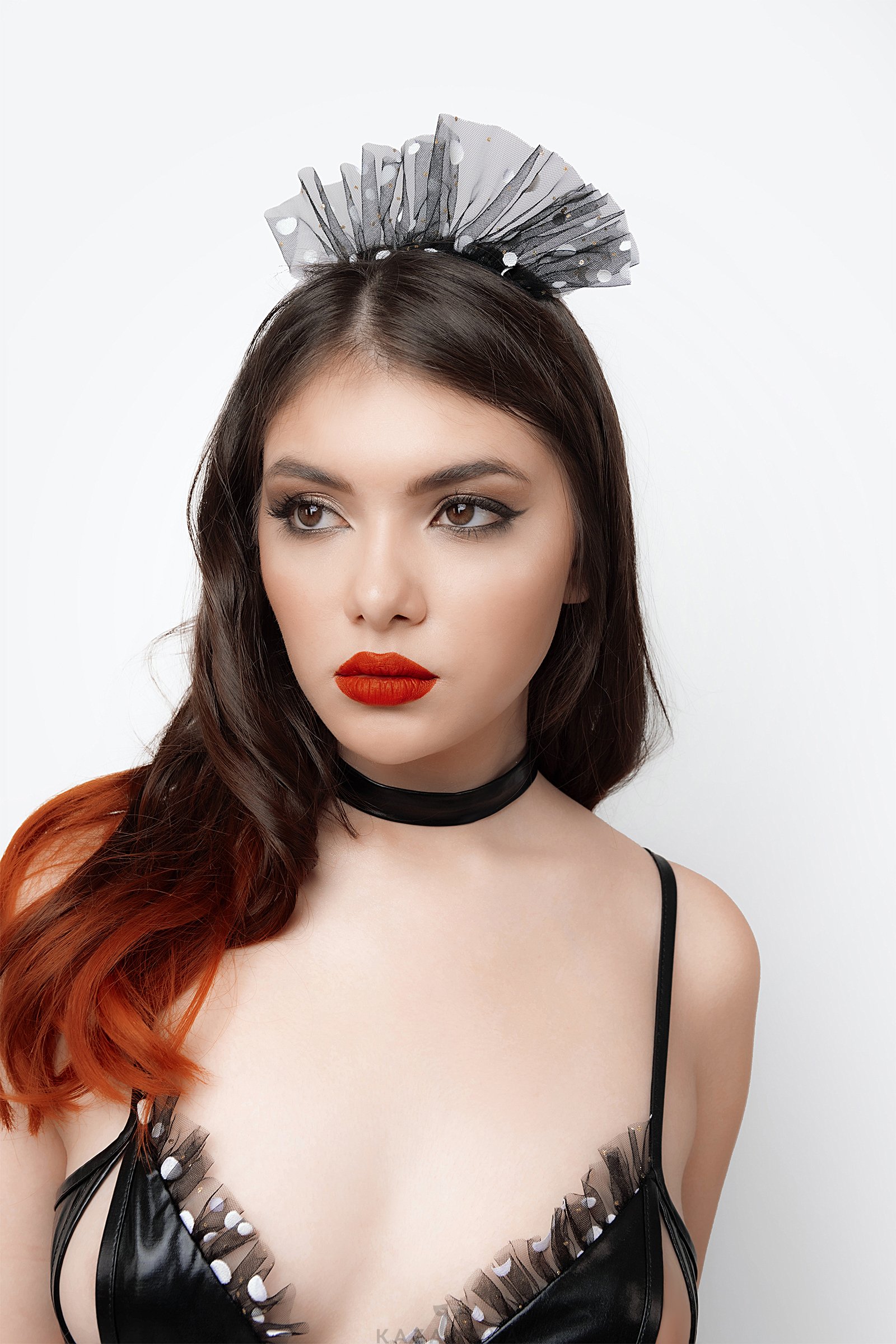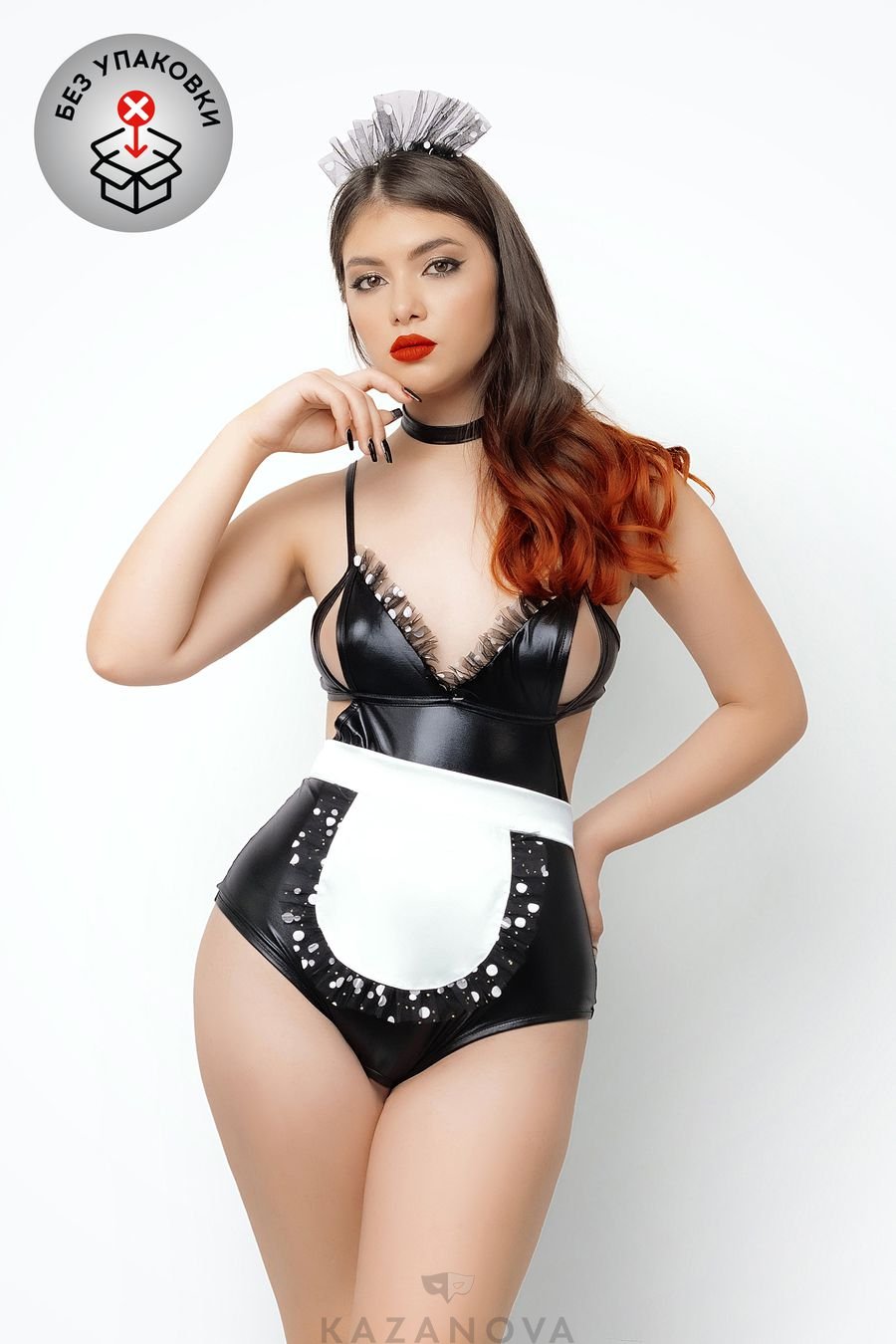 Облегающее боди подчеркивает талию и открывает ягодицы. Лиф с откровенным декольте и вырезами обнажает чувствительные зоны, а регулируемые бретели и двухрядная застежка на спине слегка поддерживают грудь. Эластичный трикотажный материал с напылением wetlook соблазнительно выглядит, приятен на ощупь, комфортен в носке. Дизайн модели скрывает живот и подчеркивает соблазнительные объемы. Минималистичный чокер на кнопке привлекает внимание к ключицам и гладкой коже. Атласный фартук с длинными завязками подчеркивает талию, притягивает внимание наблюдателя к попе и вносит элемент игры во время показа. Головной убор завершает образ.
