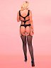 Черный комбинезон из мелкой и крупной сетки плотно облегает тело, оставляет открытой грудь и ягодицы. Сетка имитирует корсет и чулки с поясом и пажами.