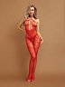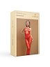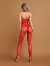 Комбинезон красного цвета изготовлен из эластичной ткани в сетку.