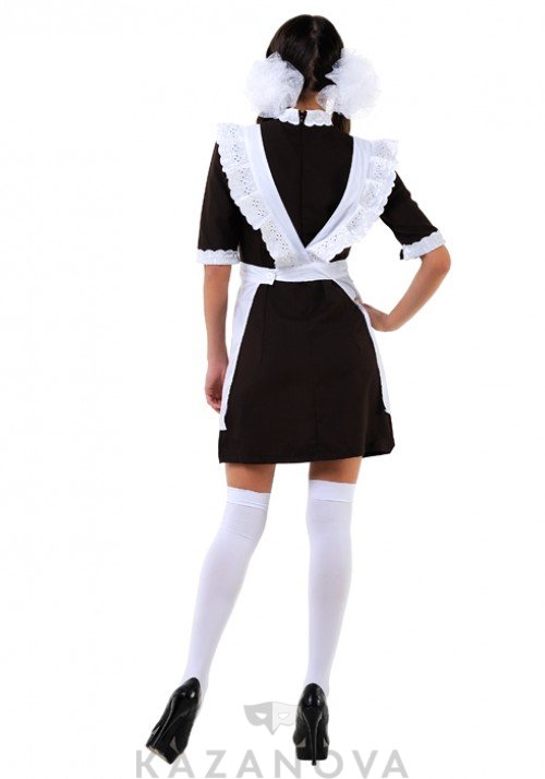 Традиционная школьная форма СССР состоит из короткого и закрытого платья коричневого цвета с кружевным воротником-стойкой. Белый фартук с обделкой воланами выделяет грудь и подчеркивает талию.