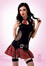 Дерзкий наряд подчеркивает все соблазнительные прелести. Клетчатый галстук привлекает внимание к зоне декольте, а топ с кружевными вставками делает талию визуально тоньше. Короткая юбка в складку приоткрывает бедра и подчеркивает стройные ножки. Пояс с заклепками и пажами для чулок делает образ бунтарским.