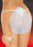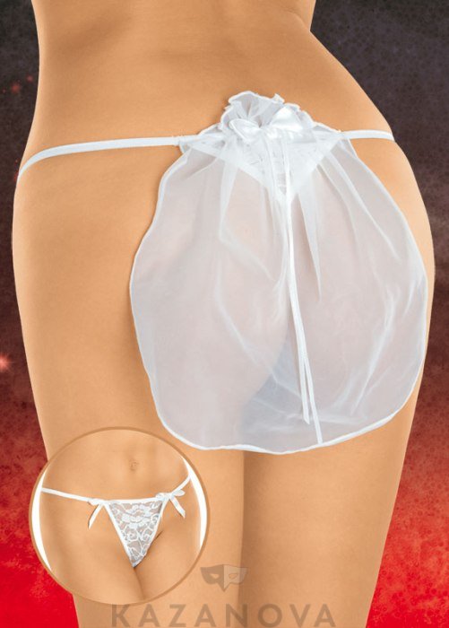 Эти очаровательные игривые трусики-стринги выглядят настолько сексуально, что мужчина не сможет сдерживать свой восторг при виде Вашего тела, облаченного в них! Кружевные стринги, декорированные сзади «фатой». Полупрозрачное жабо прикрывает попку. Спереди трусики украшены атласными бантиками.