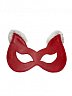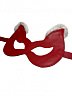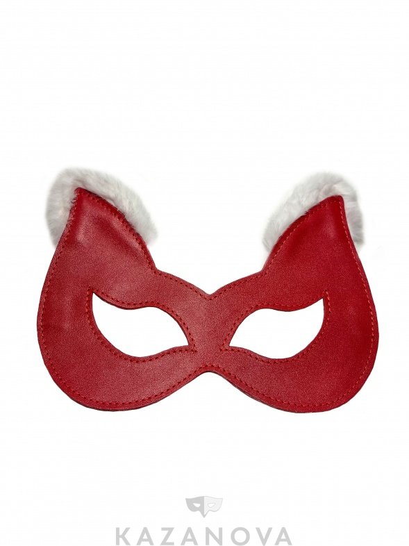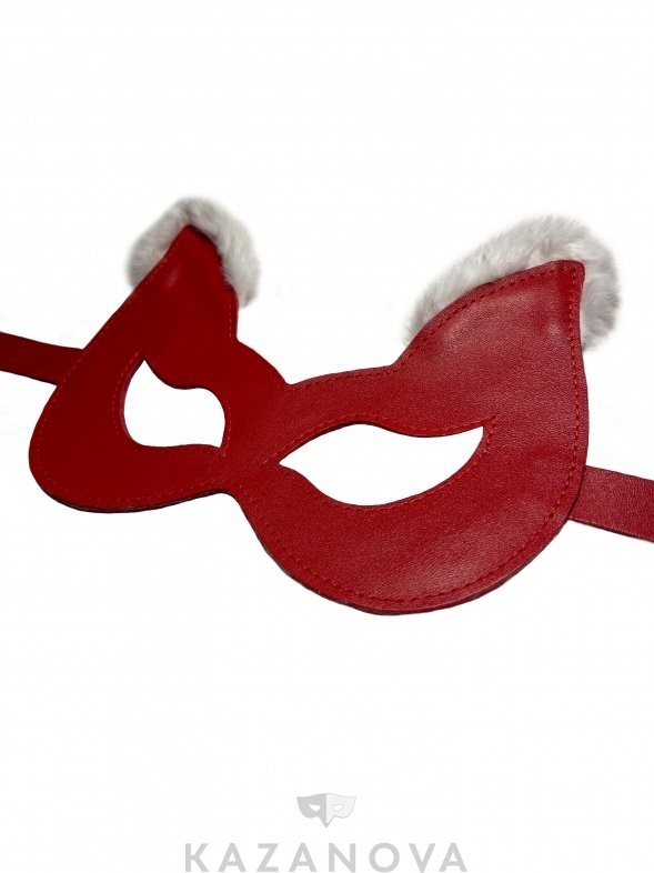 Маска изготовлена из натуральной кожи красного цвета и декорирована белым мехом. Размер универсальный, аксессуар подстраивается под индивидуальные параметры.