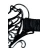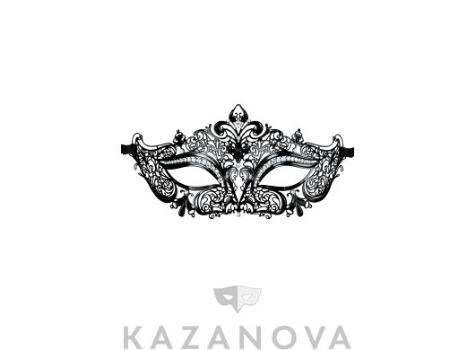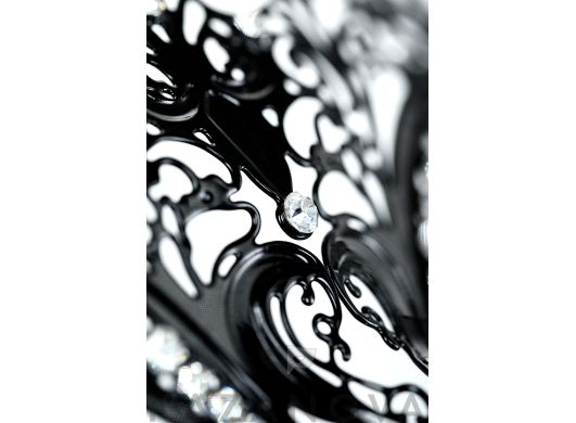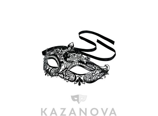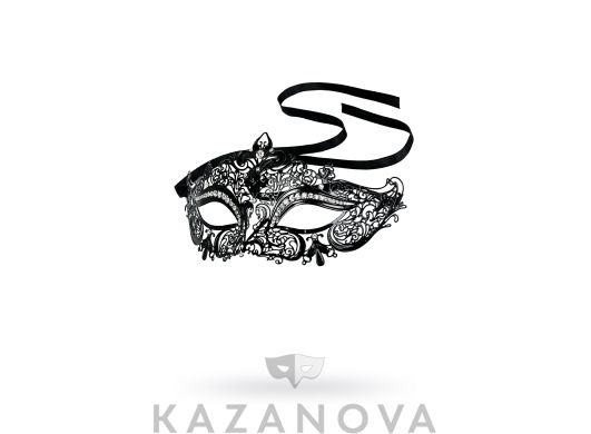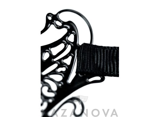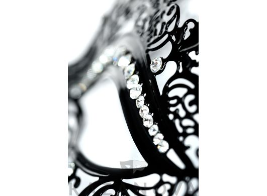 Маска черного цвета изготовлена из искусственной кожи и декорирована металлическими элементами.